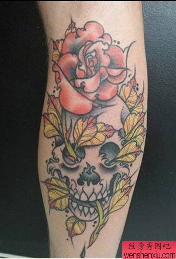 一张腿部骷髅玫瑰花文身作品