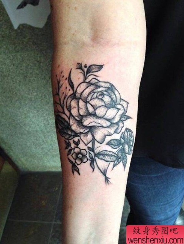 纹身图吧分享一张手臂黑白玫瑰文身作品