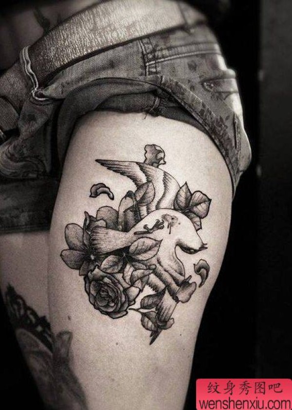 纹身图吧分享一张女性腿部鸽子玫瑰文身作品