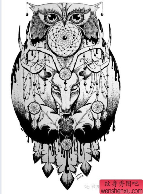 纹身图吧分享一张黑白猫头鹰文身手稿作品