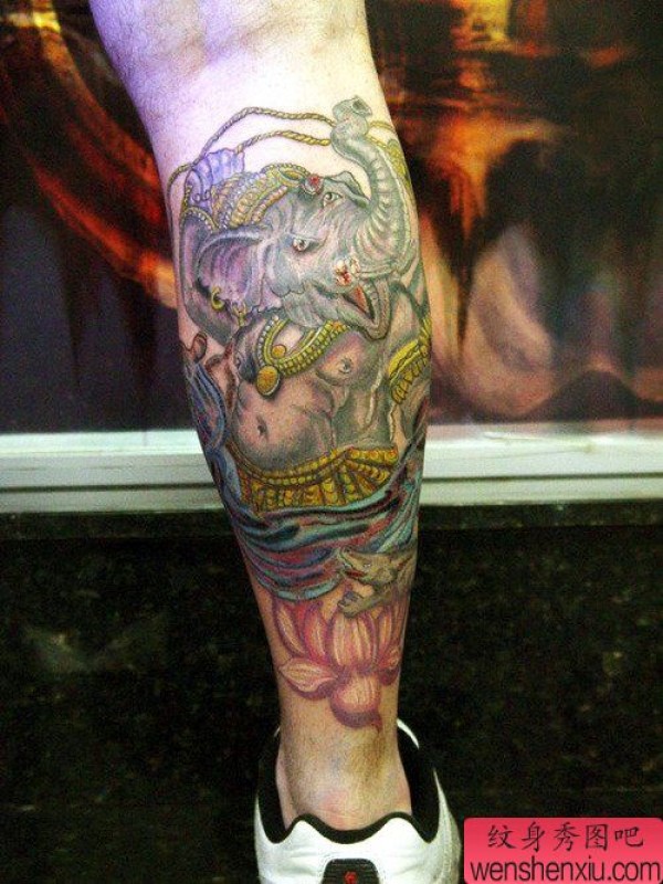 文身馆分享一张腿部宗教彩色象神文身作品