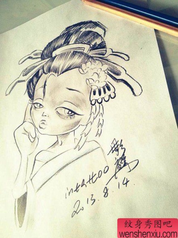 纹身图吧分享一张艺妓线稿文身手稿作品