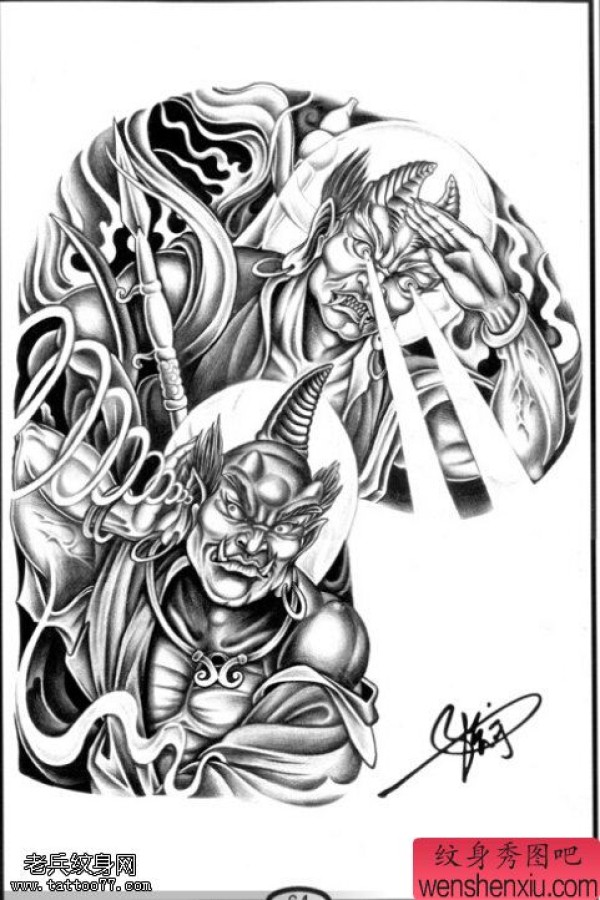 纹身图吧分享一张半胛哼哈二将文身手稿作品