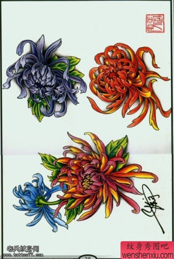 一张彩色菊花文身手稿作品由纹身图吧分享