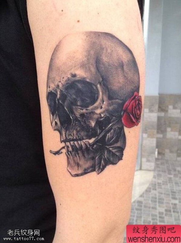 纹身图吧分享一张手臂骷髅玫瑰文身作品