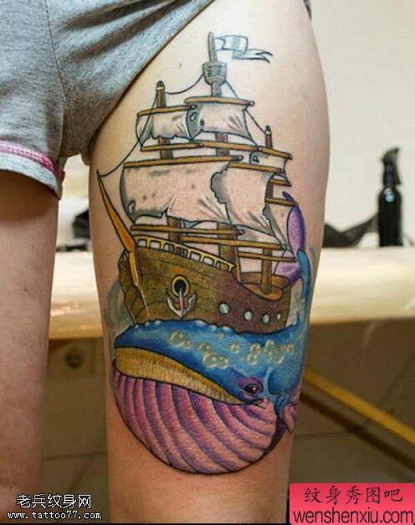 腿部彩色帆船鲨鱼文身作品由纹身图吧分享