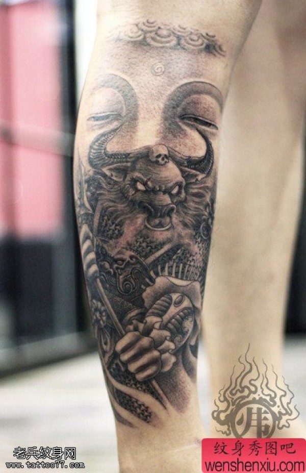 一张腿部黑灰牛魔王文身作品由文身分享