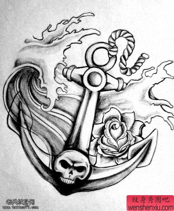 纹身图吧分享一张船锚骷髅玫瑰花文身作品