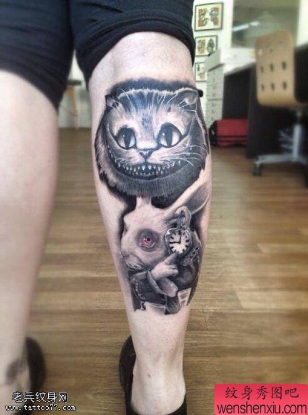 纹身图吧分享一张腿部兔子猫咪文身作品