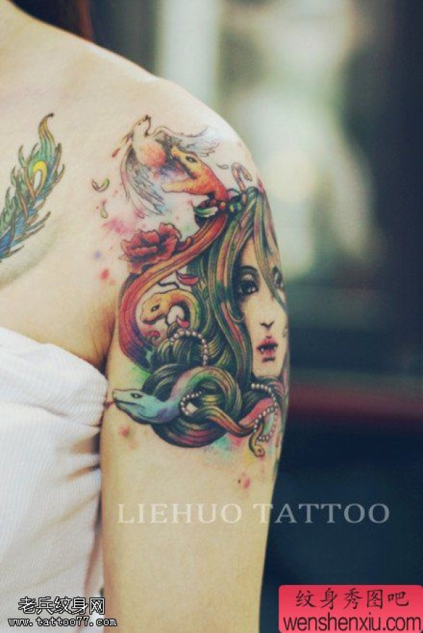 纹身图吧分享一张手臂彩色美杜莎文身作品