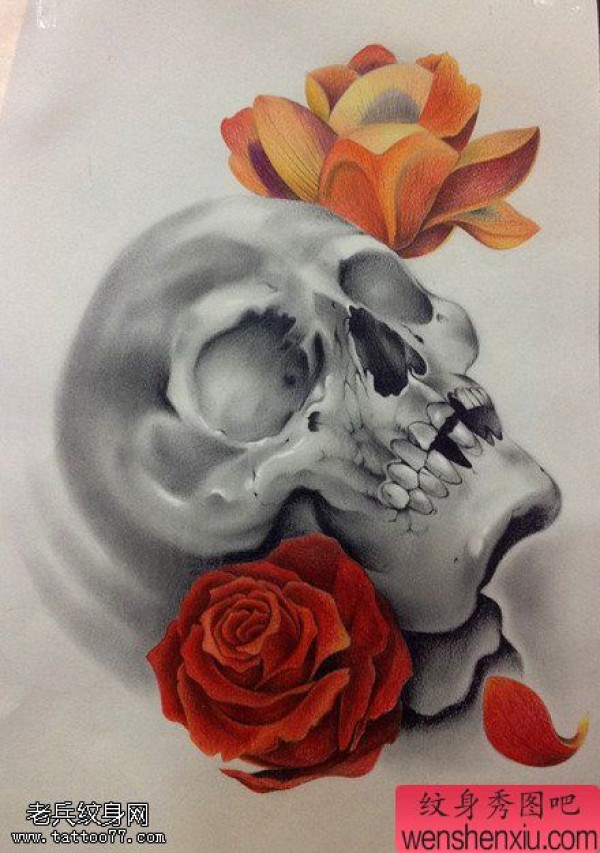 一张黑白骷髅玫瑰文身作品由纹身图吧分享