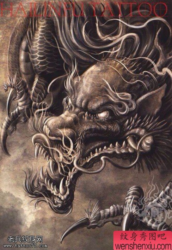 龙纹身手稿_一组老传统黑灰龙手稿纹身图案