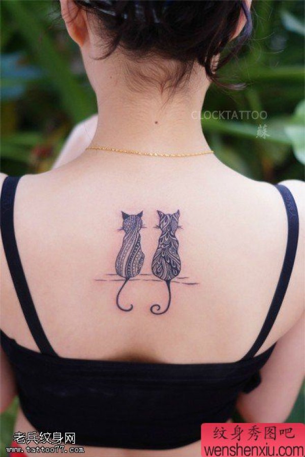 纹身图吧分享一张女性背部创意猫咪刺青图片