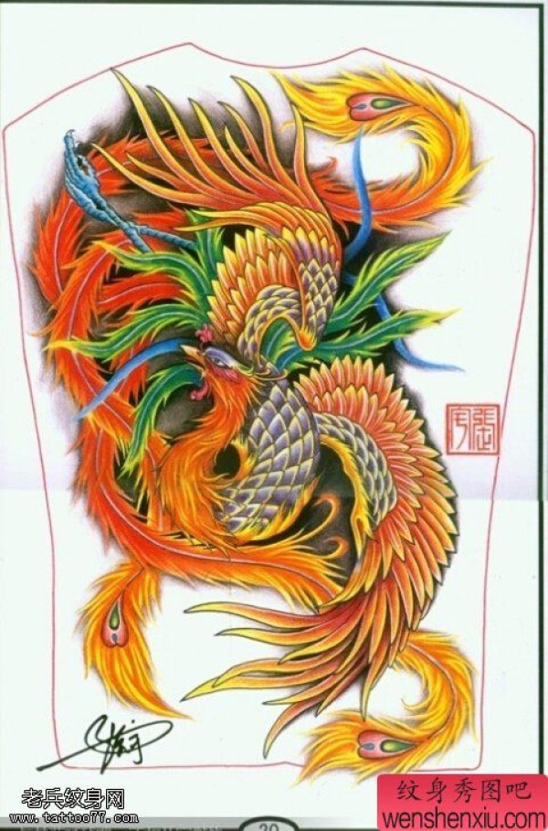 满背彩色凤凰文身手稿图片由文身馆分享