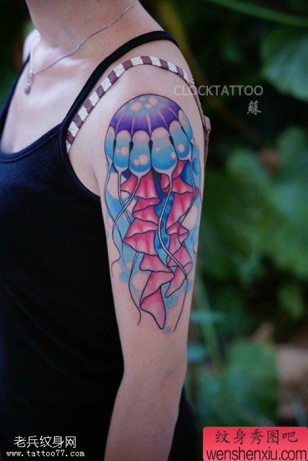 纹身图吧分享一张手臂彩色水母纹身图片