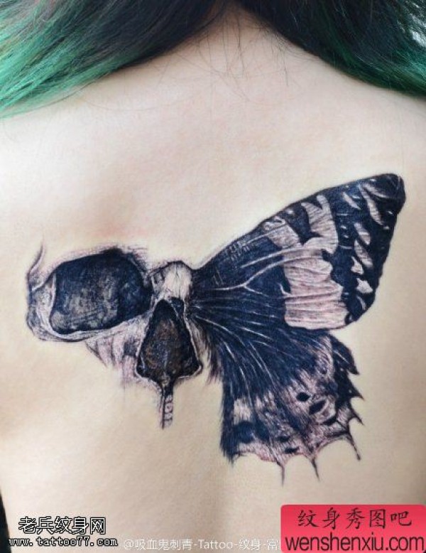 女性背部黑白骷髅蝴蝶翅膀文身图片