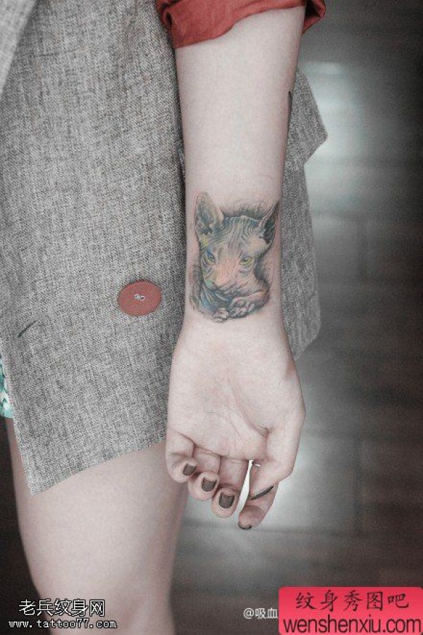 一张女性手腕斯芬克斯猫咪文身作品由文身分享