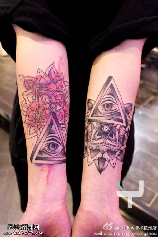 手臂彩色樊花全视之眼文身图片