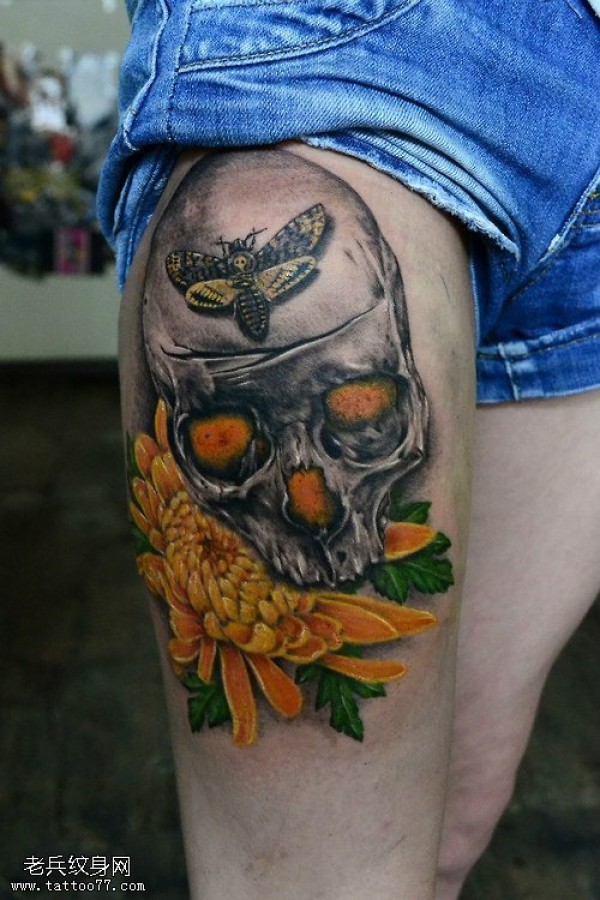 腿部彩色骷髅菊花文身图片由文身馆分享