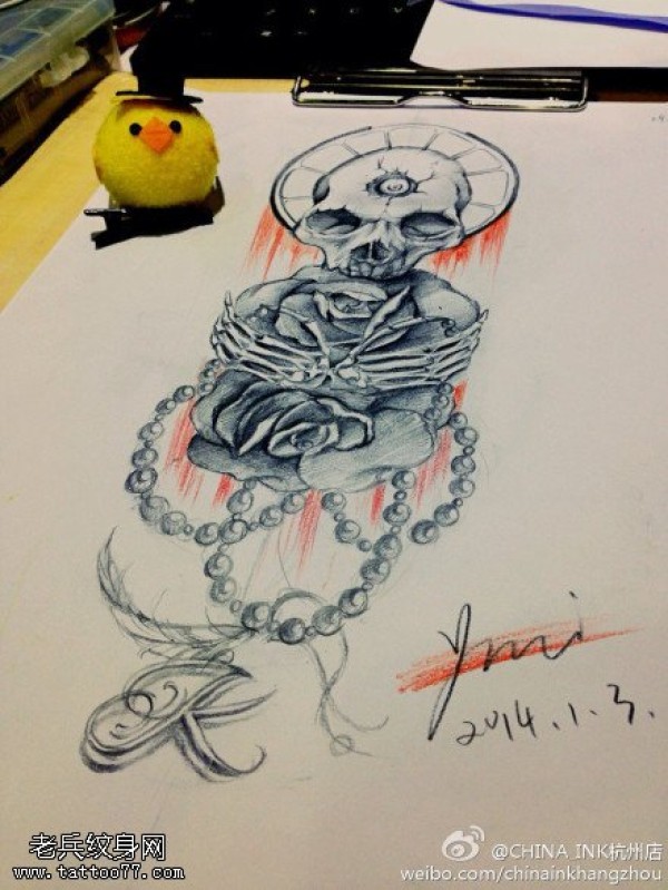 彩色骷髅玫瑰文身手稿作品由纹身图吧分享