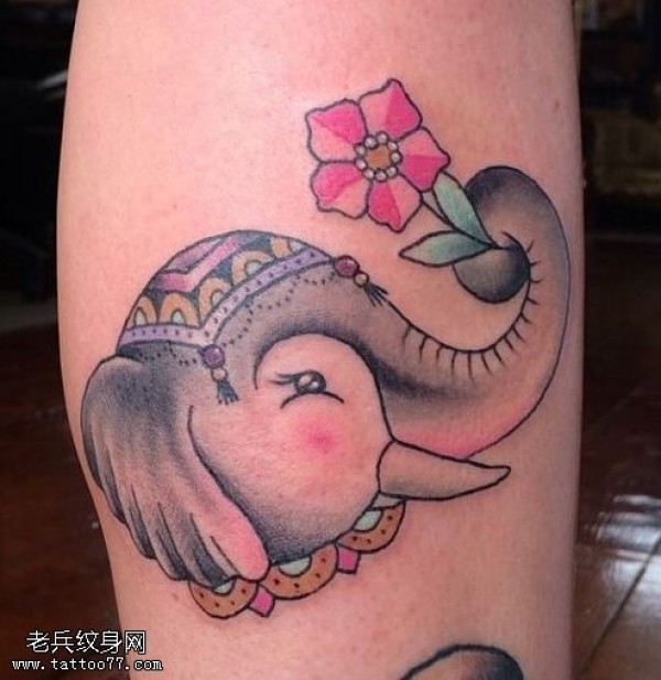 纹身图吧分享一张腿部彩色象文身图片
