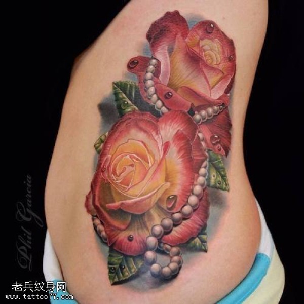 侧腰彩色玫瑰花文身图片由纹身图吧分享