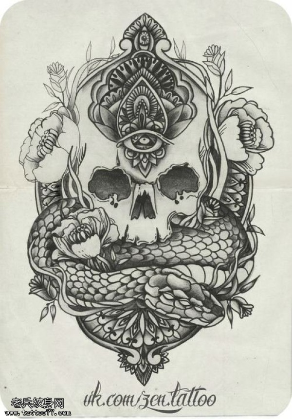 骷髅牡丹花上帝之眼蛇文身手稿作品