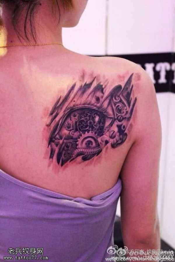 女性背部机械文身作品由纹身图吧分享