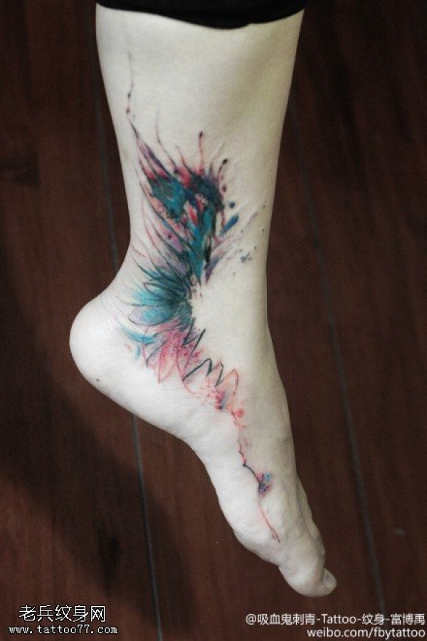 脚踝彩色孔雀羽毛文身作品由纹身图吧分享