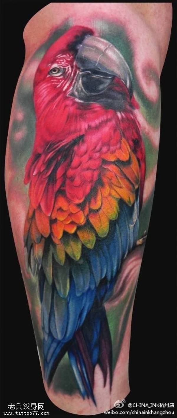 腿部彩色鹦鹉文身文身作品由文身馆分享