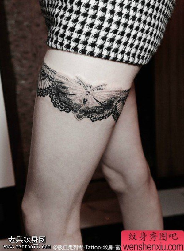 女性腿部蕾丝蝴蝶文身作品由文身馆分享
