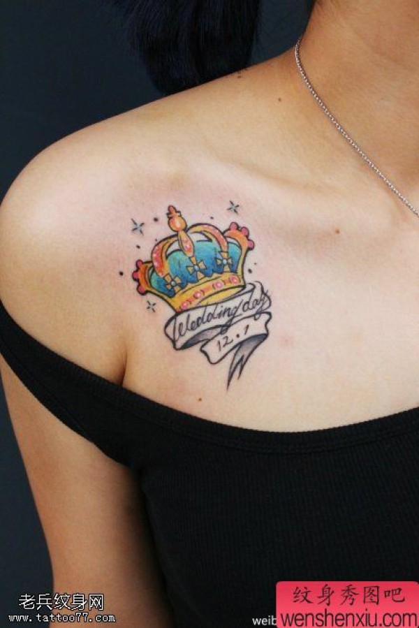 女性胸部彩色皇冠字母文身作品