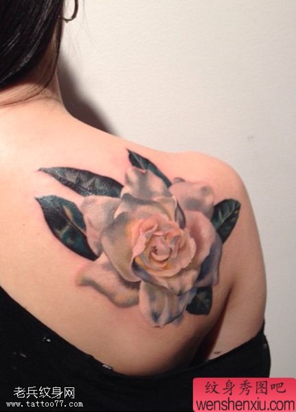 纹身图吧分享一张女性肩部玫瑰花文身作品