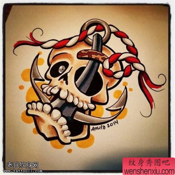 纹身图吧分享一张骷髅船锚文身手稿作品