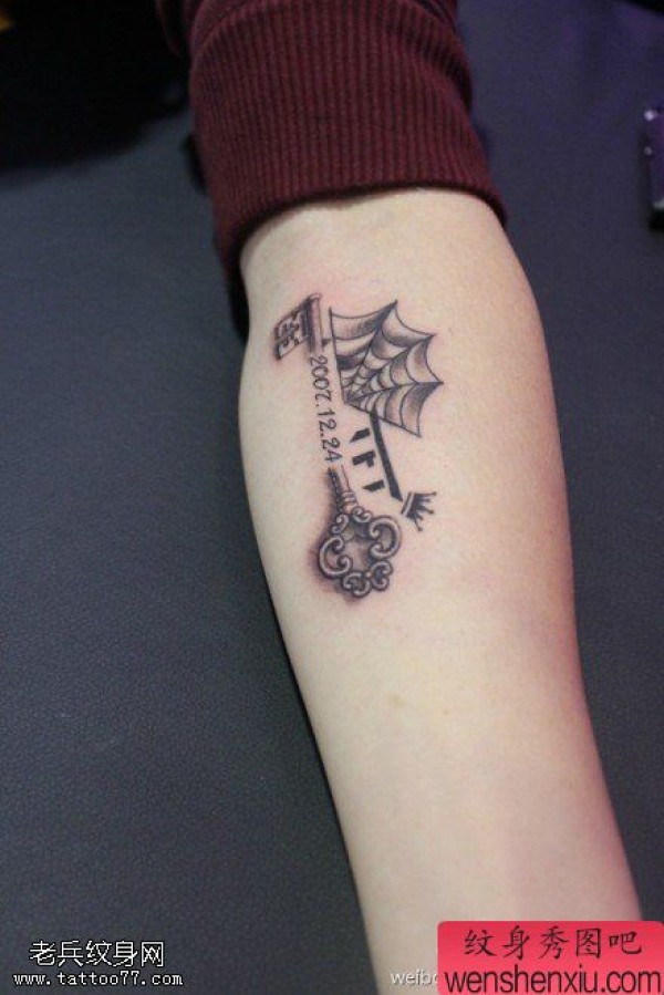 女性手臂钥匙蜘蛛网文身作品由文身分享