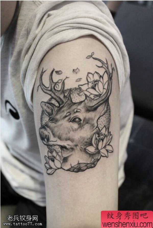 纹身图吧分享一张手臂黑白羚羊文身作品