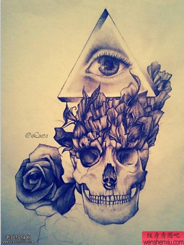 骷髅上帝之眼玫瑰花文身手稿作品由纹身图吧分享