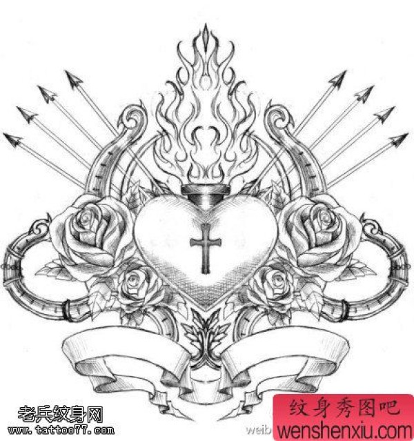 玫瑰花爱心十字架火焰箭头文身手稿作品