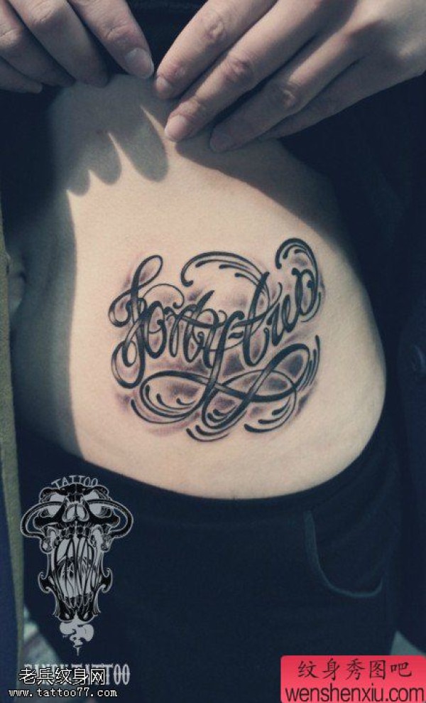 女性腹部花体字文身作品