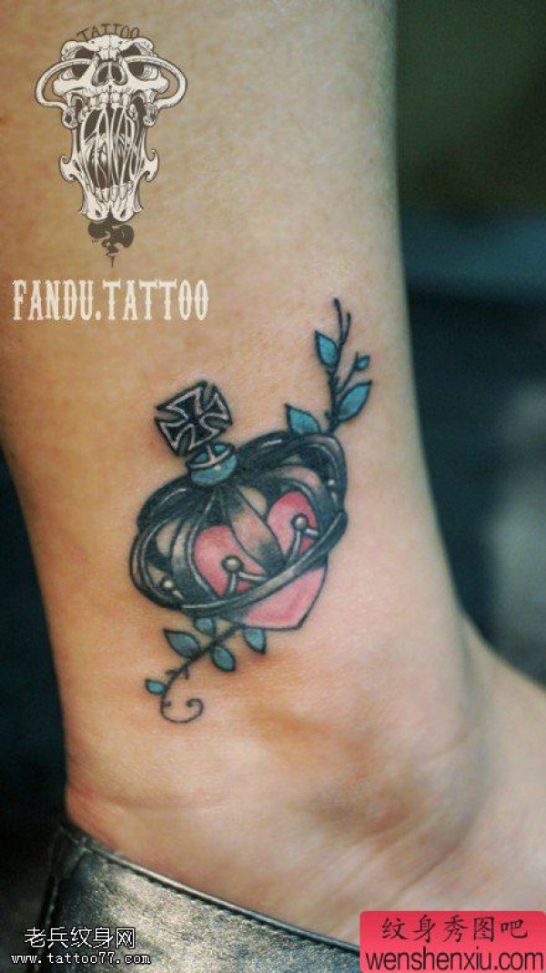 女性脚踝爱心皇冠文身作品