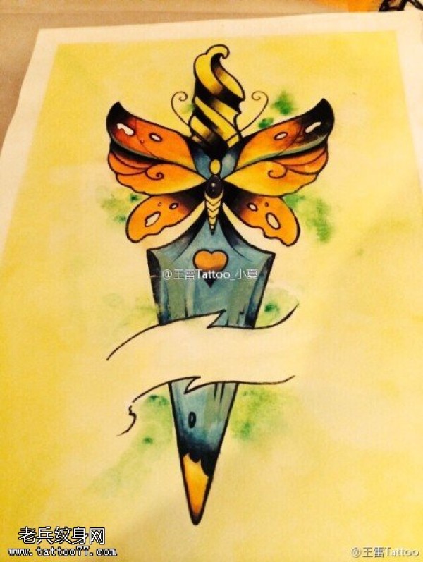纹身图吧分享一张彩色蝴蝶匕首文身作品