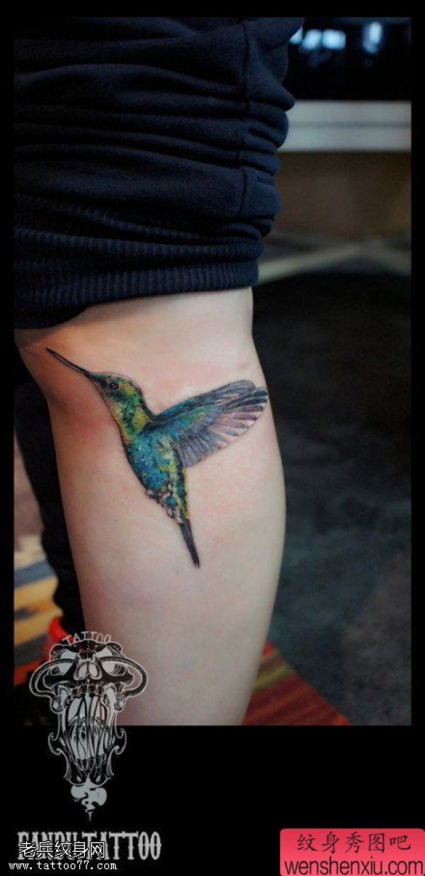 纹身图吧分享一张腿部彩色蜂鸟文身作品