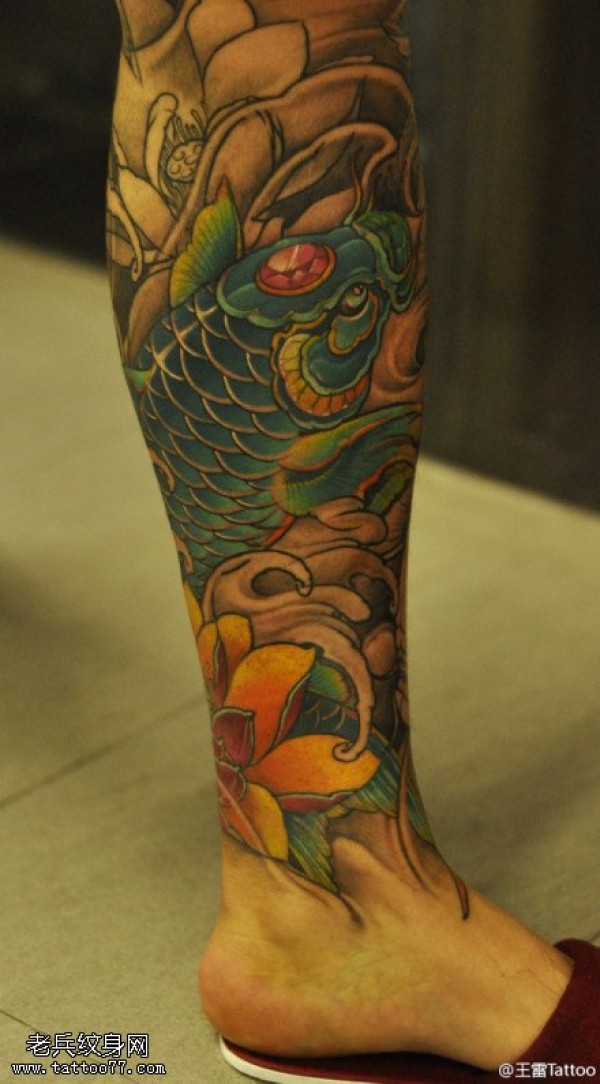 传统鲤鱼花小腿纹身_腿部纹身图案大全_纹身图吧