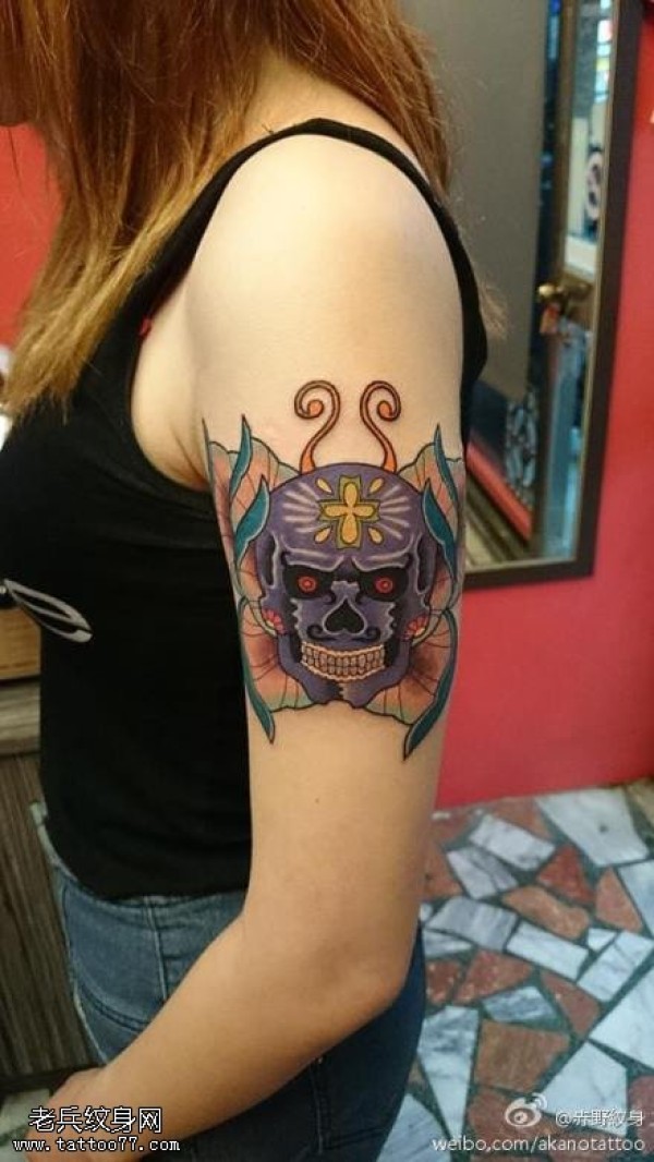 女性手臂骷髅蝴蝶文身作品由纹身图吧分享