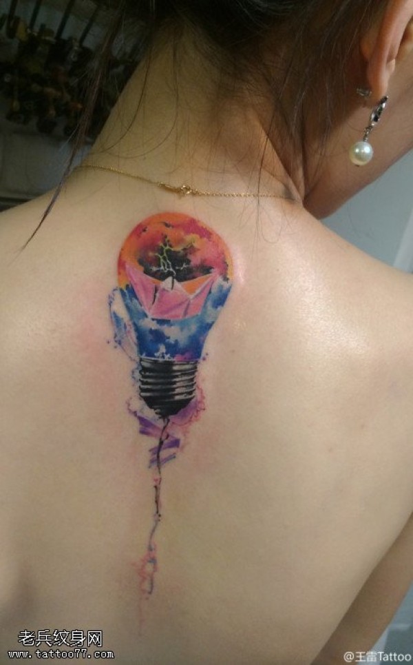 女性背部彩色电灯泡文身作品由刺青馆分享