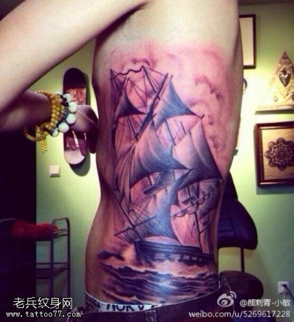 侧腰帆船文身作品由纹身图吧分享