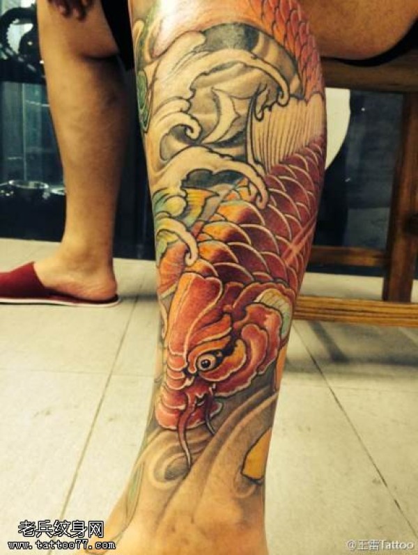 传统鲤鱼花小腿纹身_腿部纹身图案大全_纹身图吧
