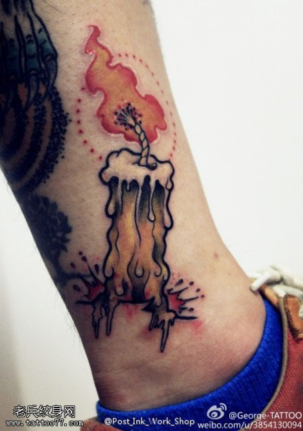 腿部彩色创意蜡烛文身作品由纹身图吧分享