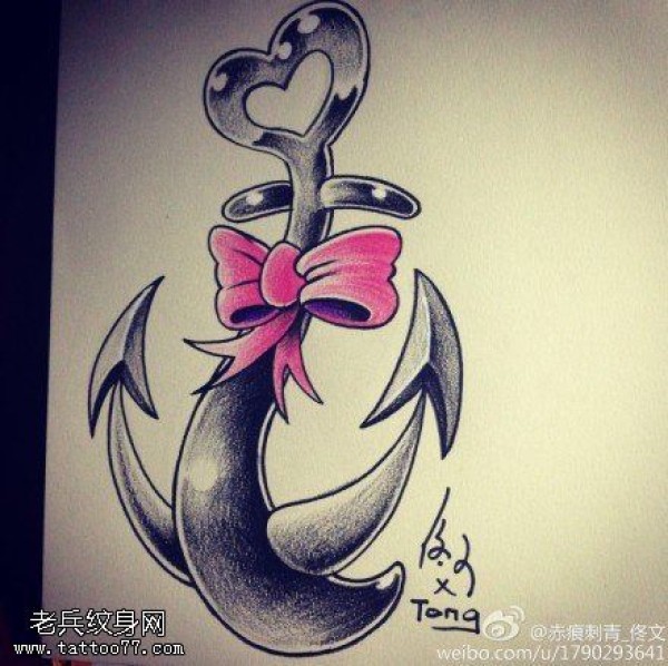 纹身图吧分享一张船锚蝴蝶结文身手稿作品