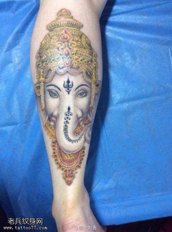 腿部彩色象神文身作品由纹身图吧分享